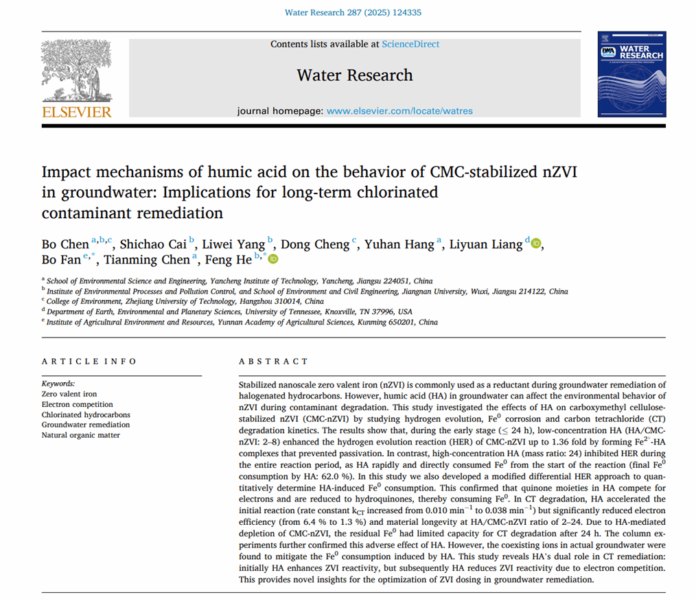 近日,williamhill英国官网水环境与污染控制研究所-陈勃博士在国际环境领域的顶级期刊《Water Research》上发表题为“Impact mechanisms of humic acid on the behavior of CMC-stabilized nZVI in groundwater: Implications for long-term chlorinated contaminant remediation”的研究成果(Water Research 287 (2025) 124335)。陈勃博士为论文第一作者,江南大学何锋教授为通讯作者。这是公司首次以第一单位在Water Research发表研究论文。Water Research创刊于1967年,由国际著名学术出版集团Elsevier发行,是环境科学与生态学领域最具权威性和影响力的顶级学术期刊之一。期刊长期致力于发表具有原创性、突破性和前瞻性的环境科学与技术研究成果,以其严谨的学术标准、卓越的论文质量和广泛的国际影响力享誉全球。根据最新发布的期刊引证报告(JCR),Water Research在2024-2025年度的影响因子达到12.4,持续位列环境科学领域Q1区期刊前列。