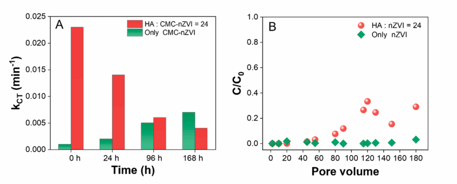 在实际地下水中, CMC-nZVI对HA存在下的CT同样有高效的降解作用,初始的反应速率可提升30倍。在连续24、96和168 h的CT完全降解(即CMC-nZVI老化反应)后,使用新鲜的CT原液恢复初始污染物浓度,监测CT降解动力学。结果表明,老化24、96及168 h后,CT脱氯速度依次减慢,kCT的速率常数从0.023 min−1下降至0.014 min−1、0.006 min−1,最终降至0.004 min−1。这些结果表明在实际地下水中,HA在CT脱氯过程中对CMC-nZVI活性影响也表现出双重作用。柱实验结果也发现反应后期(120 PV),在包含HA的砂柱出水中仍可检测到33.3%的CT,而在不含HA砂柱出水中CT去除率为100%。这些数据表明,HA逐渐消耗了nZVI中的活性Fe0,从而降低了CT的去除效率。