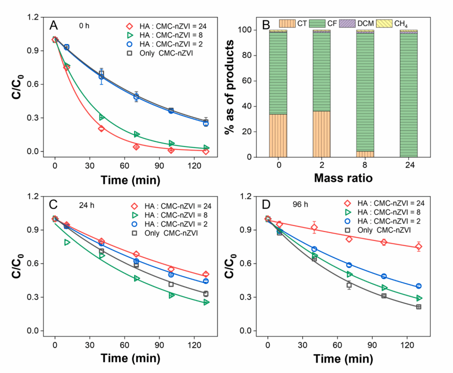 HA对CMC-nZVI不同老化阶段降解CT的反应速率及产物分析