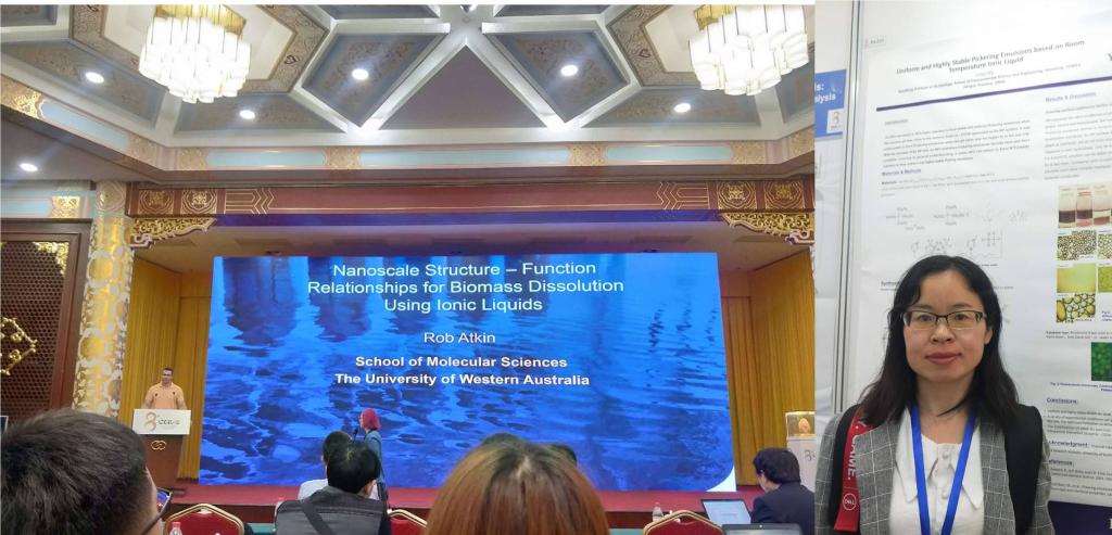中科院院士、过程工程所所长张锁江担任大会主席,会议以“离子液体创造绿色未来”为主题,从基础研究、技术创新和工业应用等多个角度展示离子液体在新能源、新材料、电子信息、生物质、生物医药、模拟计算、绿色智能过程等领域的最新成果和前沿科学进展,并展示了离子液体在二氧化碳捕集转化、烷基化、甲壳素提取利用等工业应用中的突破。公司教师吴丽敏博士参加了此次会议,并在会议中展示了题目为"Uniform and Highly Stable Pickering Emulsions based on Room Temperature Ionic Liquid”的研究成果,该研究以表面修饰的Au纳米粒子作为稳定剂,疏水性离子液体(Emin NTF2)为油相,在一定的pH范围内,实现了稳定的且液滴尺寸可调的的o/w 型Pickering乳液的制备。该研究旨在构筑基于离子液体的Pickering 乳液萃取体系,为重金属及稀土元素的绿色高效萃取提供了新的思路和平台。