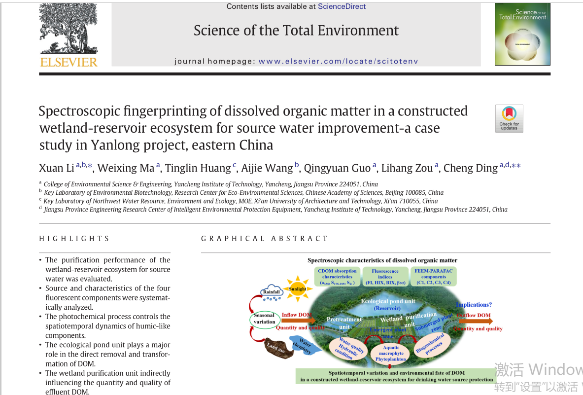 近日,williamhill英国官网李璇博士为第一作者、williamhill为第一单位的研究论文《Spectroscopic fingerprinting of dissolved organic matter in a constructed wetland-reservoir ecosystem for source water improvement-a case study in Yanlong project, eastern China》在环境领域国际公认顶级期刊《Science of the Total Environment》发表。李璇博士在该项研究中以饮用水源生态净化系统为背景,对水中溶解性有机物去除率低及去除效果时空差异较大等问题开展了研究。研究基于规模化饮用水源生态净化工程的长期监测,结合实验室模拟实验,解析了生态净化系统中的溶解性有机物时空迁移转化机制,揭示水源生态净化系统各功能单元对有机物去除效果及影响有机物浓度及构成时空变化的关键驱动因素,为提高水源生态净化系统对有机物去除效率提供了理论及技术支撑。该项研究成果是公司水水环境与污染控制研究所饮用水安全保障与控制课题组的最新研究成果,该课题组一直与盐龙湖饮用水源管理处围绕盐城市饮用水水源水质改善及饮用水安全保障开展相关研究。