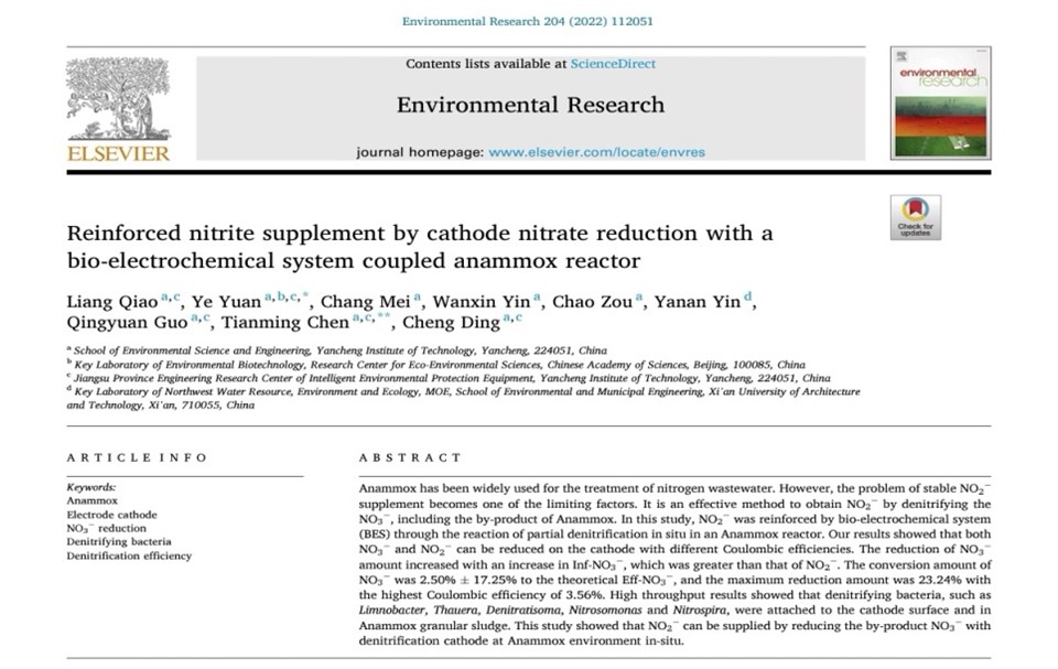 williamhill为第一单位,乔椋博士为第一作者,远野副教授、陈天明副教授为共同通讯作者的研究论文《Reinforced nitrite supplement by cathode nitrate reduction with a bio-electrochemical system coupled anammox reactor》,于环境领域期刊Environmental Research发表(2022年为中科院2区),影响因子7.90。