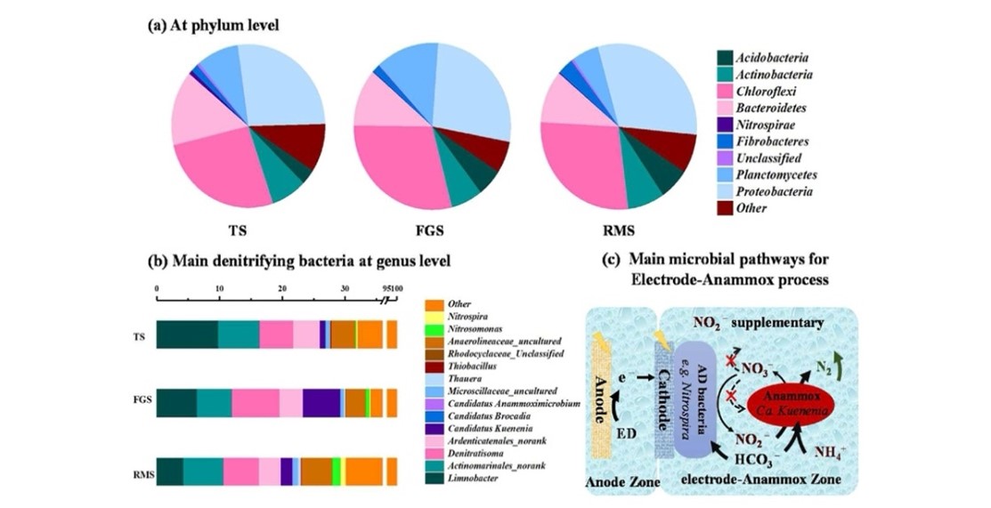 以电化学调控硝酸盐还原为亚硝酸盐,通过电位控制实现反硝化生物阴极在多氮素底物结构下还原硝酸盐,为厌氧氨氧化脱氮提供电子受体。通过对反硝化生物阴极表面微生物、反应器底泥的高通量分析与对比,发现反硝化功能菌群的明显富集,证明了生物电化学调控硝酸盐还原路径的可控性。
