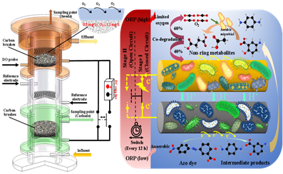本研究创新性地提出了“厌氧阴极还原耦合限氧阳极氧化及其间歇电场刺激”的新工艺,解决了传统生物还原和氧化过程中缺乏电子、矿化效率低等问题。课题组将此工艺应用于偶氮废水的深度处理并收获了理想效果,此工艺还可运用于含卤代、硝基等毒性基团的废水治理,极具探索价值。