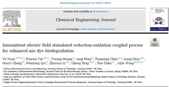 近日,远野副教授和殷万欣硕士为共同第一作者、丁成教授为通讯作者的研究论文《Intermittent electric field stimulated reduction-oxidation coupled process for enhanced azo dye biodegradation》(Yuan et al., Chem. Eng. J., 2023, 451, 138732)在工程技术领域权威期刊《Chemical Engineering Journal》发表。该期刊2022年影响因子16.744。