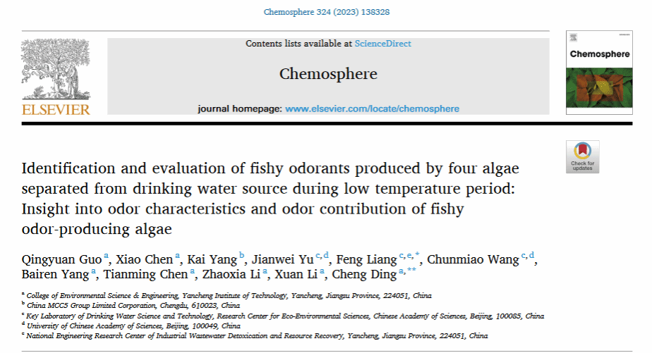 近日,郭庆园老师为第一作者、丁成教授为通讯作者的研究论文《Identification and evaluation of fishy odorants produced by four algae separated from drinking water source during low temperature period: Insight into odor characteristics and odor contribution of fishy odor-producing algae》(Guo et al., chemosphere, 2023, 324, 138328)在环境科学与生态学领域权威期刊《chemosphere》发表,该期刊2022年影响因子8.943。