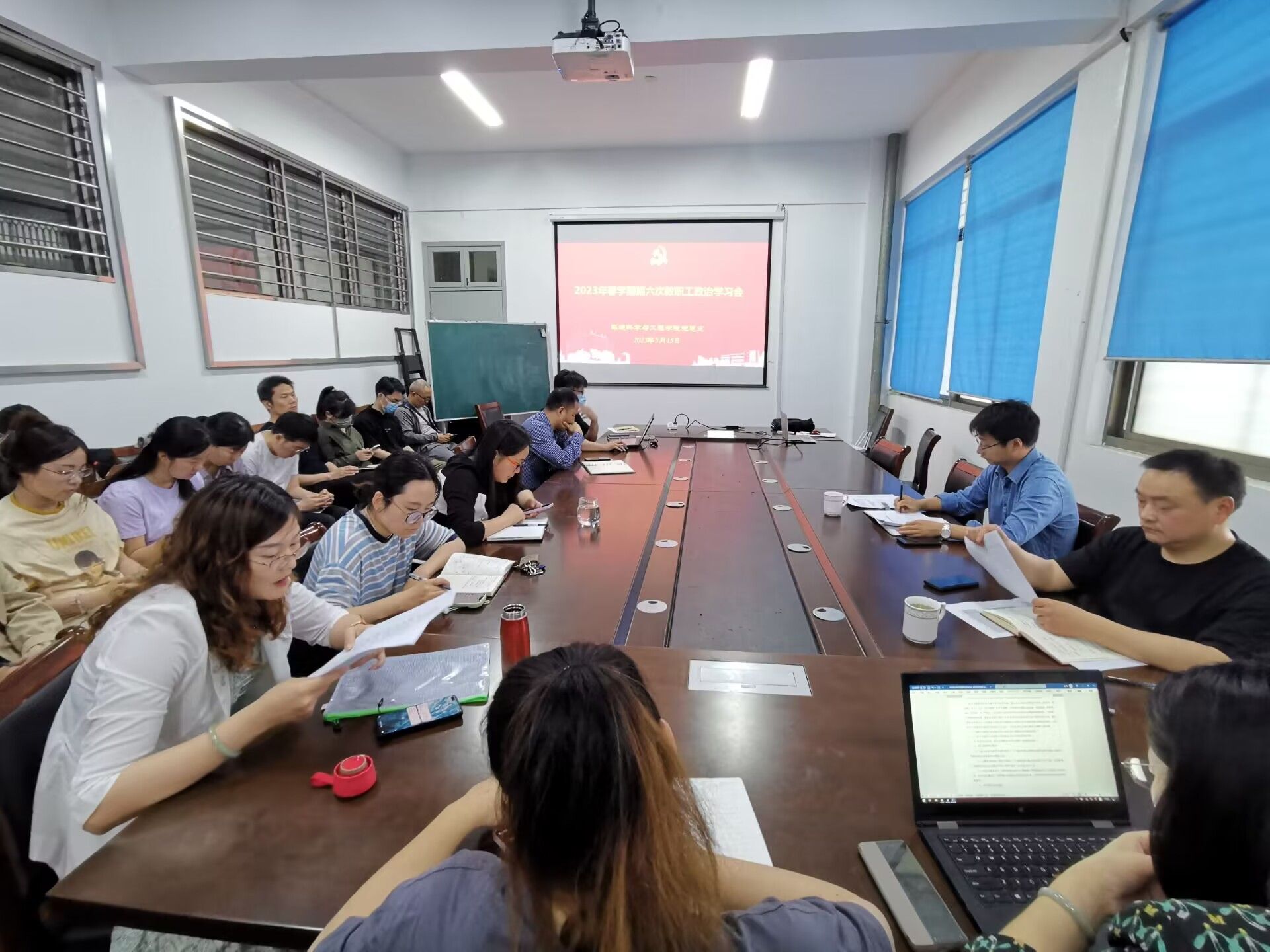 5月17日下午,在北校区老员工活动中心三楼会议室,公司召开2023年春学期第六次教职工政治学习,会议由副经理陈天明(主持工作)主持,环工系主任李璇领学,全体教职工参加。