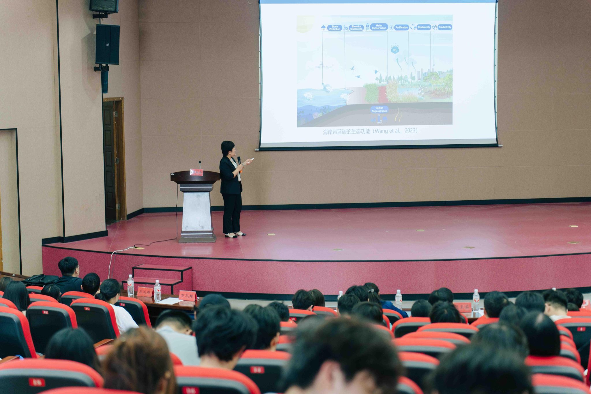 大会最后,江苏省海洋地质调查院副经理、williamhill客座教授闫玉茹女士带来了题为“守护蔚蓝 ‘碳’索未来——盐城蓝色碳汇与实践”的精彩讲座。闫教授深入阐释了海洋在全球气候变化中的关键作用,并重点介绍了盐城作为沿海城市在蓝色碳汇研究与实践中的独特优势及进展。她强调,通过科学的海洋管理和生态修复,不仅能促进海洋生态系统健康,更能显著提升海洋碳汇(碳吸收)能力,为应对全球气候变化贡献“盐城力量”。