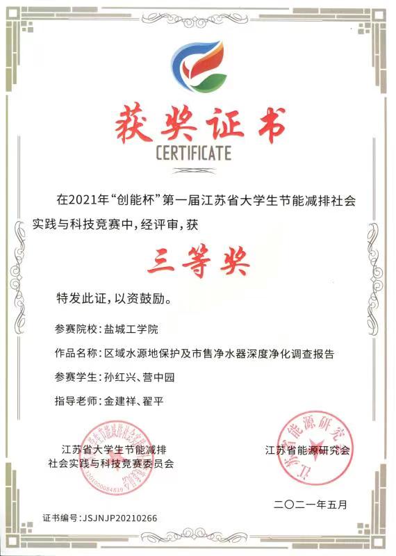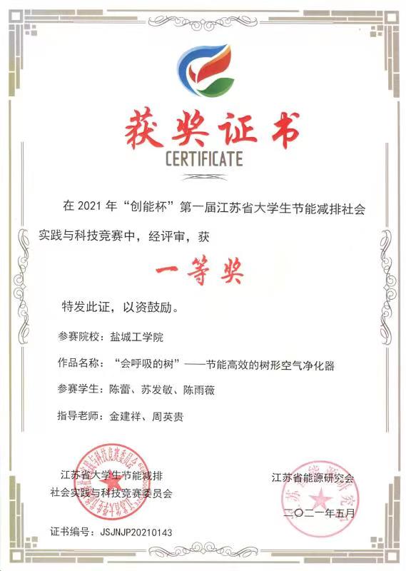 5月15日至16日,由东南大学,江苏省能源研究会主办的第一届江苏省老员工节能减排社会实践与科技竞赛暨“创能杯”全省作品线上初审,决赛在南京市钟山宾馆举办线下决赛答辩。公司金建祥、周英贵老师指导的项目《“会呼吸的树”——节能高效的树形空气净化器》入围决赛,并获得一等奖;金建祥、翟平老师指导的项目《区域水源地保护及市售净水器深度净化调研报告》获得三等奖。