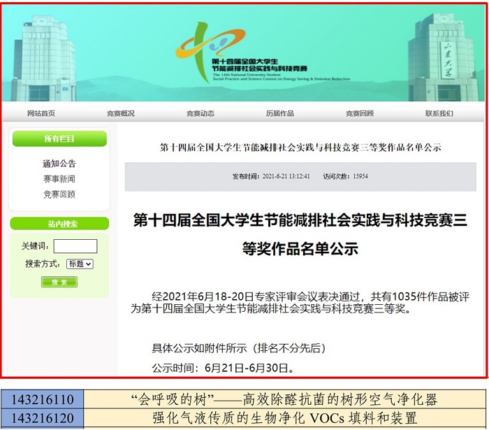 6月21日,全国老员工节能减排社会实践与科技竞赛委员会秘书处发布了第十四届全国老员工节能减排社会实践与科技竞赛三等奖作品名单公示,根据获奖作品公示名单,由公司员工完成的2项科技作品《“会呼吸的树”——高效除醛抗菌的树形空气净化器》和《强化气液传质的生物净化VOCs填料和装置》获得三等奖。