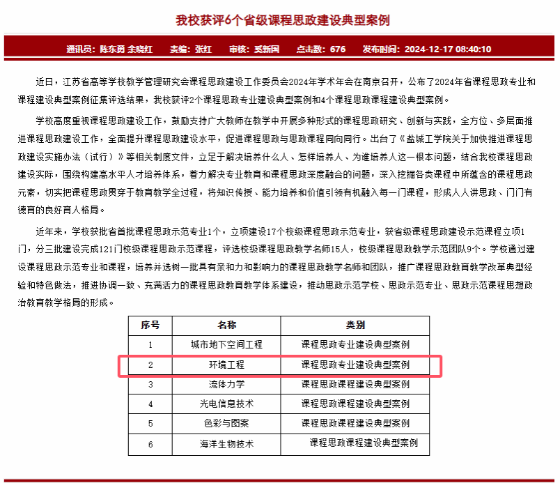 近日,江苏省高等公司教学管理研究会课程思政建设工作委员会2024年学术年会在南京召开,公布了2024年省课程思政专业和课程建设典型案例征集评选结果,公司环境工程专业获评江苏省课程思政专业建设典型案例。
