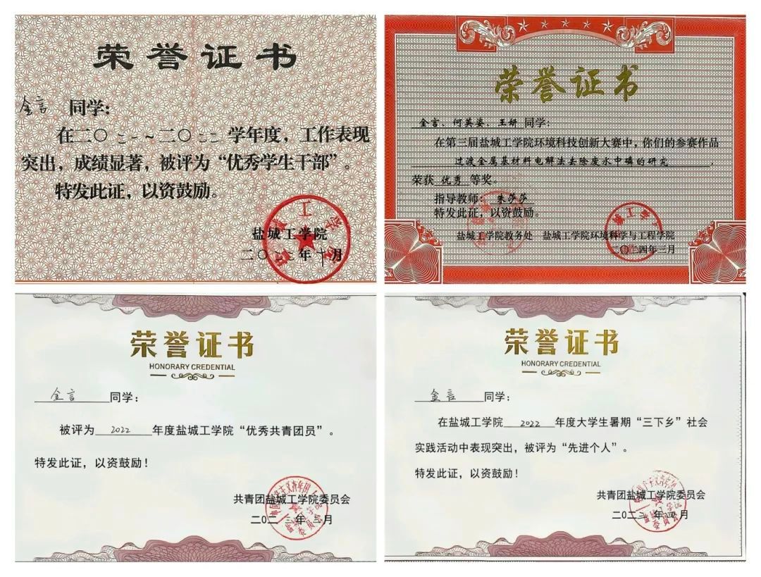 在校期间,金言学习成绩优异,获国家励志奖学金及多次学业奖学金;积极参与公司工作,服务同学并获得校三好员工、优秀员工干部等荣誉称号;科研方面,参与发表SCI论文一篇,专利三项;在“互联网+”江苏省老员工创新大赛,参与项目获江苏省三等奖。