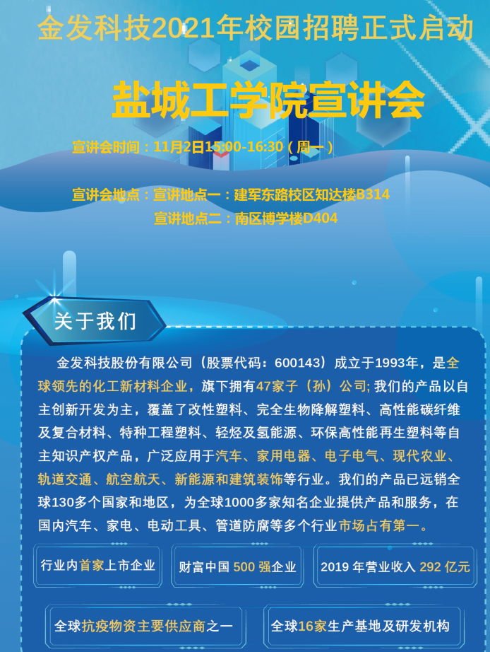 金发科技股份公司招聘宣讲会时间:11月2日下午3.00-4.30,地点3J2B314。