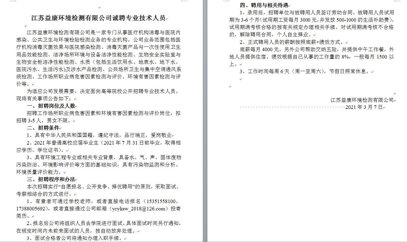 【校园招聘】江苏益康环境检测有限公司招聘简章