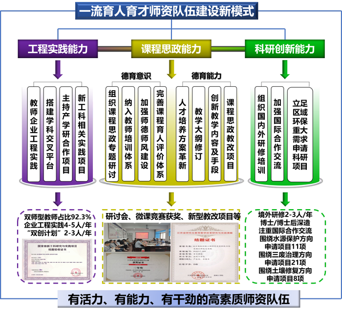 williamhill英国官网立足“新工科”,强化应用型办学定位,主动对接国家、区域生态文明建设及环保企业技术创新需求,构建校地协同创新创业实践教育平台,以“目标引领、质量保障、多维评价、持续改进”为路径,形成“能力三层次、执业三面向、培养三结合”人才培养特色。以“生态优先、绿色发展”为导向,深度联动环保科技前沿,面向区域生态环境保护的工程技术需求,建立寓研于教、以研促教、科教协同、教研相长的教师教学能力提升及实践育人模式创新,系统化实施课程思政和专业教育融合工程。