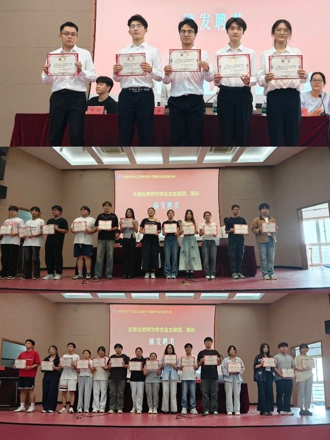 王丽坤宣读任职通知。在主席台就坐的老师为新一届员工会成员颁发聘书。