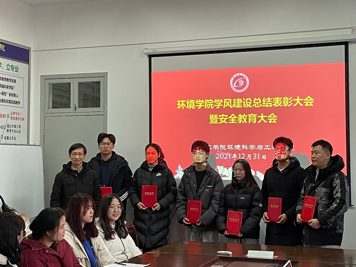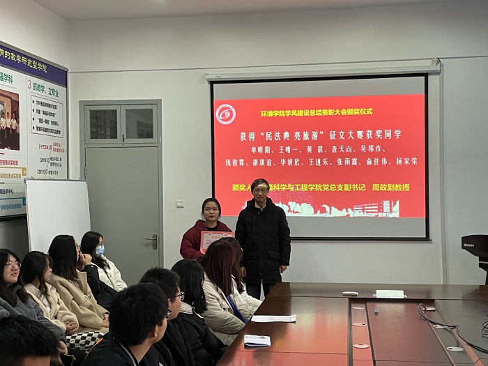 学工办主任沈丹宣读了学风建设工作表彰决定,包括江苏省三好员工徐韵淞、江苏省暑期社会实践先进个人梁晨逸、江苏省“挑战杯”黑科技专项赛获得者吴梦蕾、梅畅、孙红兴、江苏省节能减排创意大赛一等奖获得者苏发敏受到了表彰。团委副书记陈超然宣读了“民法典.亮旅游”征文大赛获奖名单,包括单明阳、王唯一等11位同学。周政分别为获奖同学颁奖。