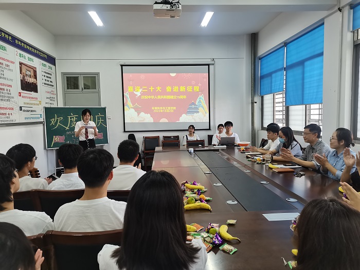 10月2日,williamhill英国官网于会议室开展“喜迎二十大,奋进新征程”的国庆系列活动。公司党总支副书记周政,学工办主任沈丹,专职辅导员陈超然、王翔及大一员工代表40余人参加本次活动。